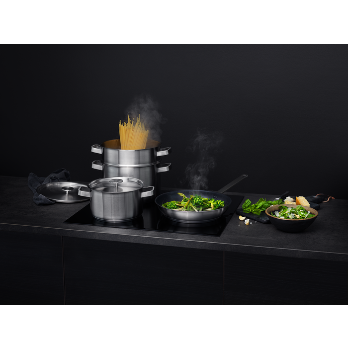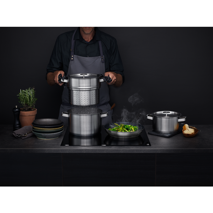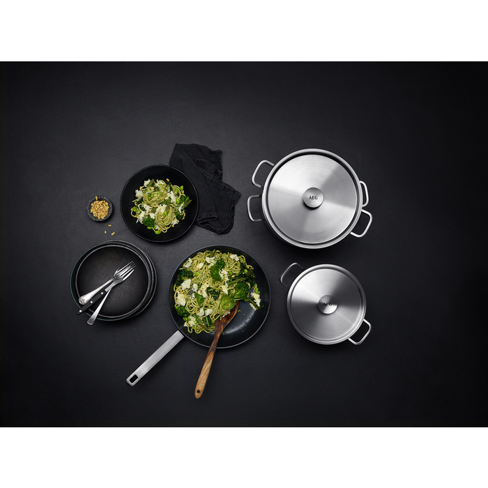 Kombinovaná sada nádobí od AEG nabízí nekonečné možnosti stravování. Tvoří ji 28cm pánev na smažení s nepřilnavým povrchem, 4l a větší 6l hrnec s pokličkami a nerezové síto na těstoviny. To je vše potřebné pro účinnější každodenní vaření.