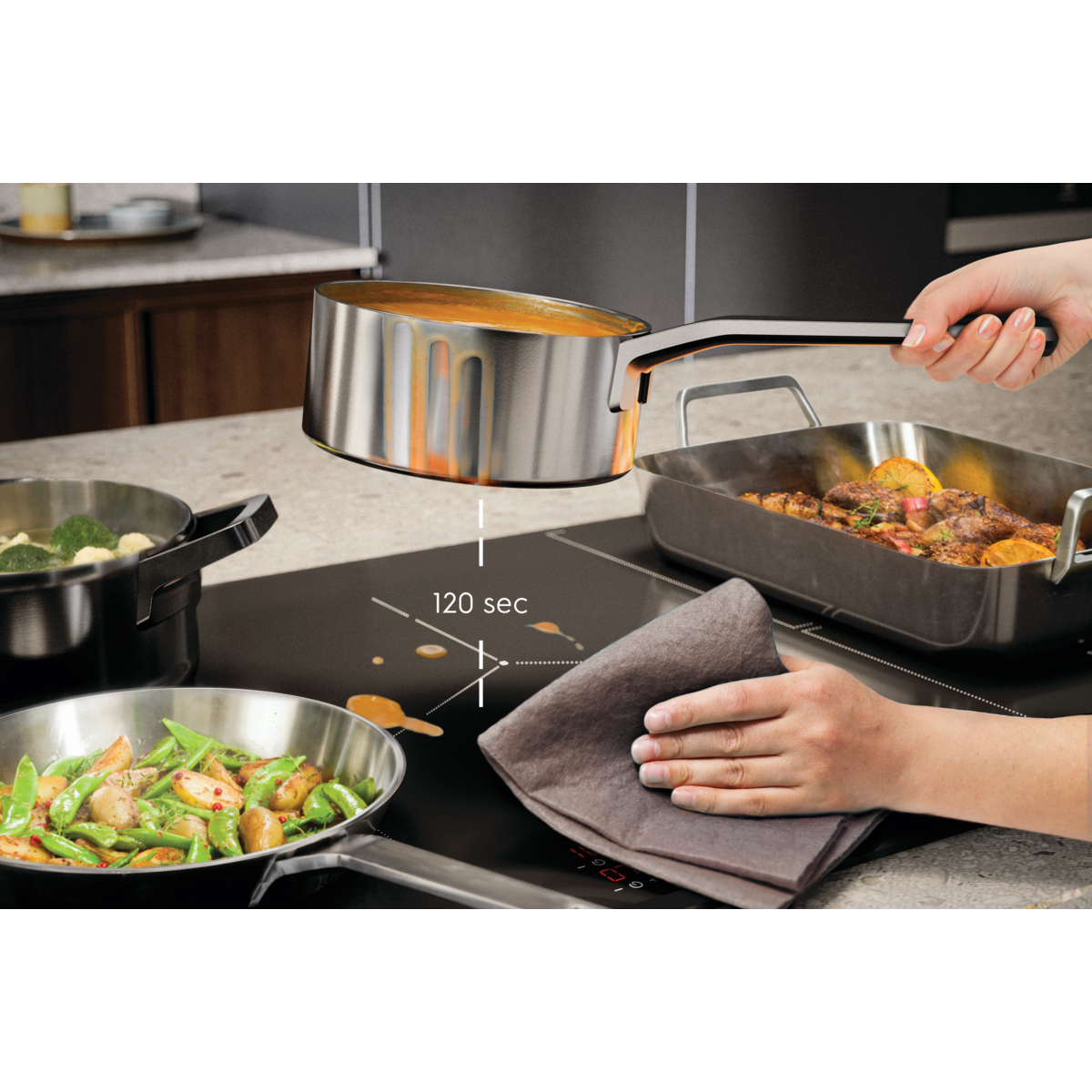 Indukční varná deska 6000 Bridge snadno zvládne i velké pánve. Pomocí funkce Bridge propojíte dvě varné zóny na dvou stranách varné desky, takže můžete použít jakoukoli velkou pánev nebo dlouhý pekáč. Propojená zóna bude mít jednotné nastavení teploty a času.