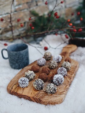 3. Ze směsi tvarujeme kuličky, doprostřed vložíme vždycky jeden oříšek, potom je poléváme rozehřátou čokoládou a obalíme v kokosu, kakau nebo rozsekaných oříškách. Vše nakonec necháme ztuhnout asi 30 minut v ledničce.