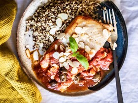 - Tip 2: K tomuto receptu se hodí snad každá příloha. Díky rajčatové omáčce i suché přílohy, jako je quinoa na fotkách, kuskus, bulgur, rýže, ale i brambory, …