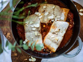 4 filety okouna nilského (nebo jiné bílé ryby), 400 g konzerva celých konzervovaných rajčat (mohou být i drcená), 3 bobkové listy, 3 stroužky česneku, oloupaný, na plátky nakrájený, 1 lžíce olivového oleje, 2 lžíce balsamikové redukce, 2 lžíce oliv taggiasca (*úvod), mořská sůl, čerstvě mletý pepř