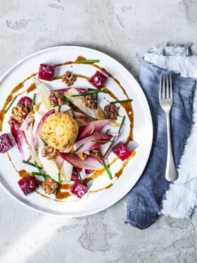 Červená řepa s kozím sýrem je oblíbená klasika. Pro osvěžení přidejte čekanku a sýr ukryjte do variace na trojobal.
