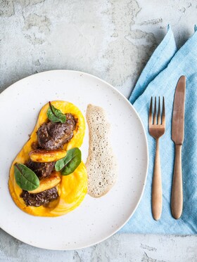 Vepřová líčka dušená v cideru s bramborovo-mrkvovým pyré