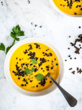 Také fandíte vydatný krémovým polévkám? Tu s křupavou čočkou beluga a batáty musíte zkusit!